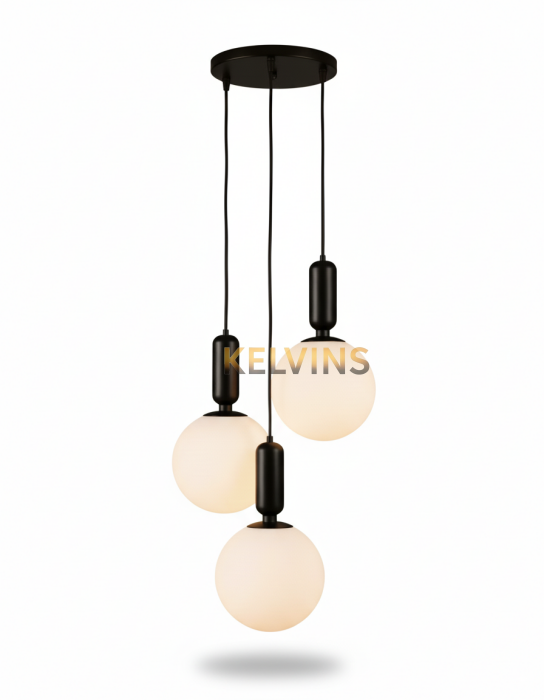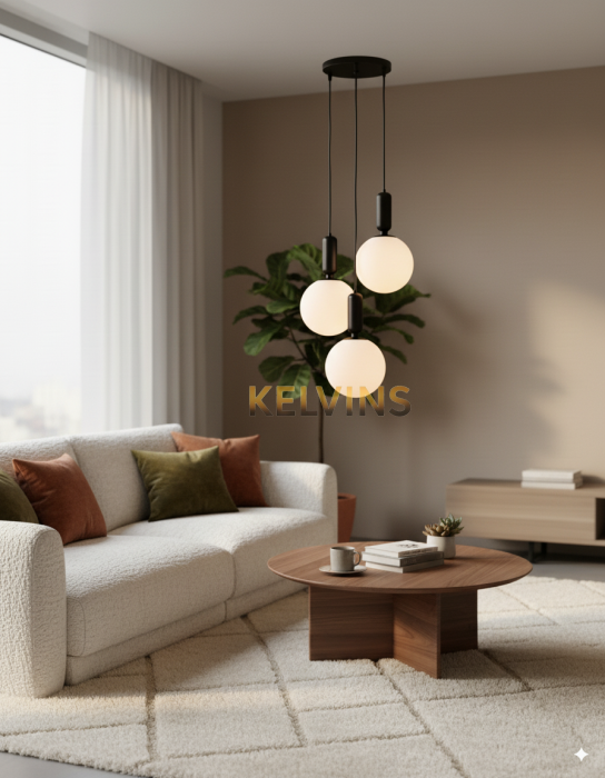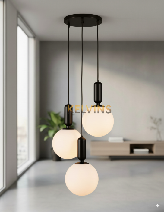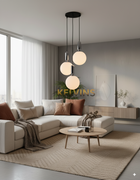 Suspension élégante à trois boules en verre opale, idéale pour salon, salle à manger ou entrée. Design moderne, lumière douce et chaleureuse, parfaite pour créer une ambiance raffinée.