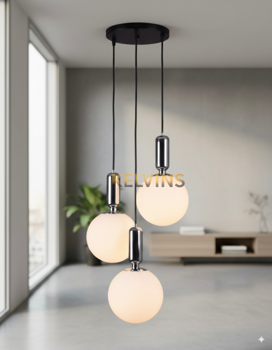 Suspension élégante à trois boules en verre opale, idéale pour salon, salle à manger ou entrée. Design moderne, lumière douce et chaleureuse, parfaite pour créer une ambiance raffinée.