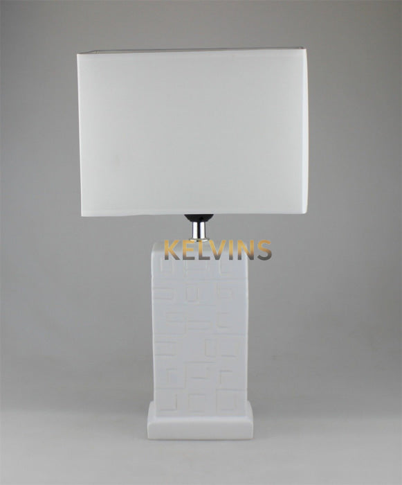 FONTANA WHITE Lampe de chevet composée d'une base en céramique blanc rectangulaire à motifs et d'un abat-jour rectangle habillé en blanc, Dotter est équipée d'un câble d'alimentation avec interrupteur et prise de secteur.