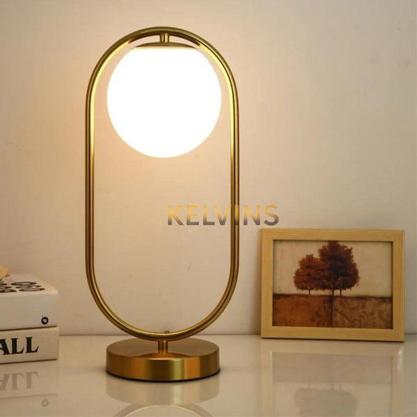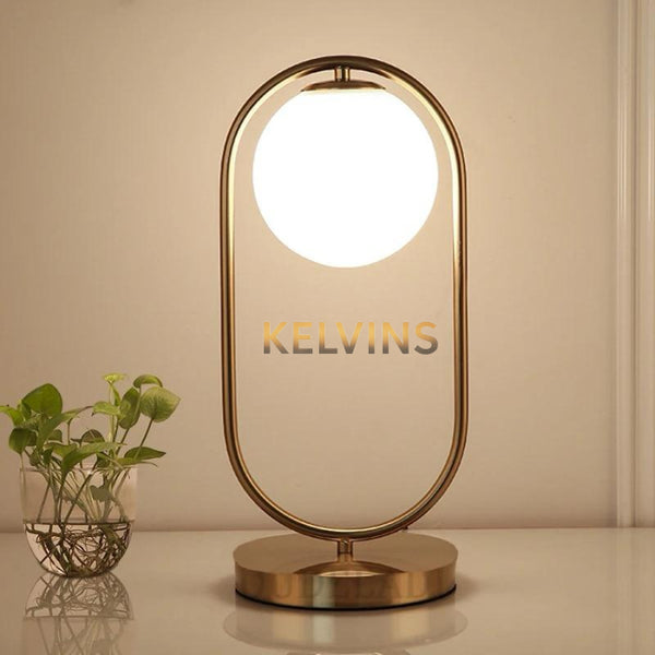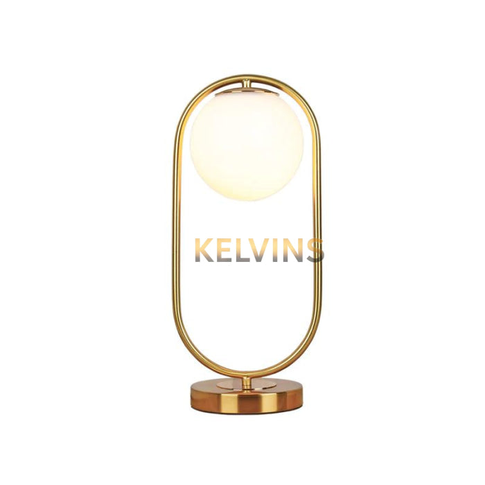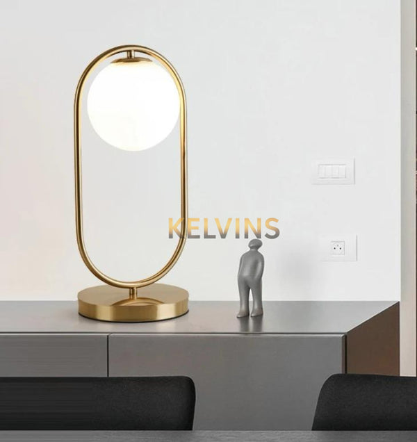 Lampe à poser ALTO GOLD , modèle haut de la collection constituée d'un pied métallique et d'un diffuseur sphérique en verre opalin soufflé, présentée ici dans une finition associant un piétement en laiton brossé à un diffuseur opalin.
