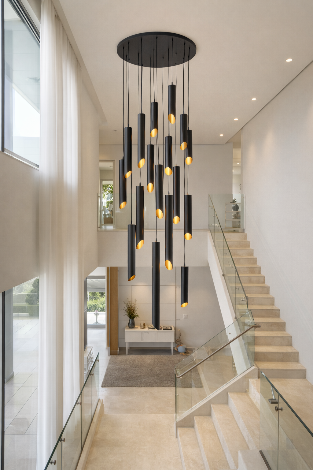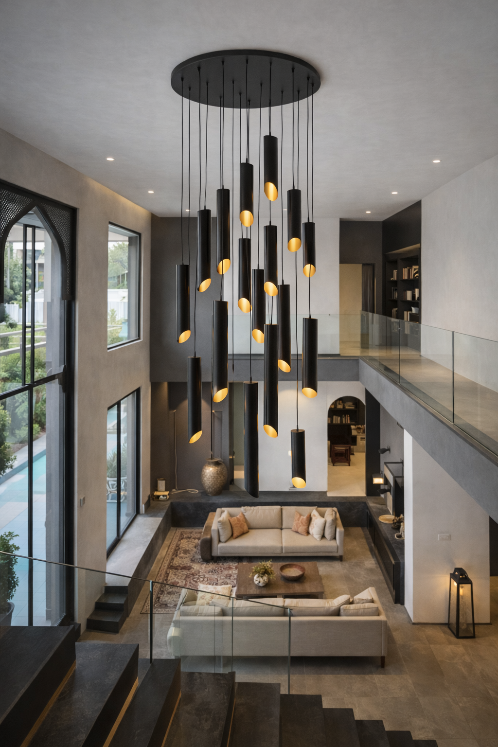 Avec ses lignes verticales élégantes et son éclairage chaleureux orienté vers le bas, cette suspension devient la pièce maîtresse idéale pour sublimer les doubles hauteurs, mezzanines et grands volumes.