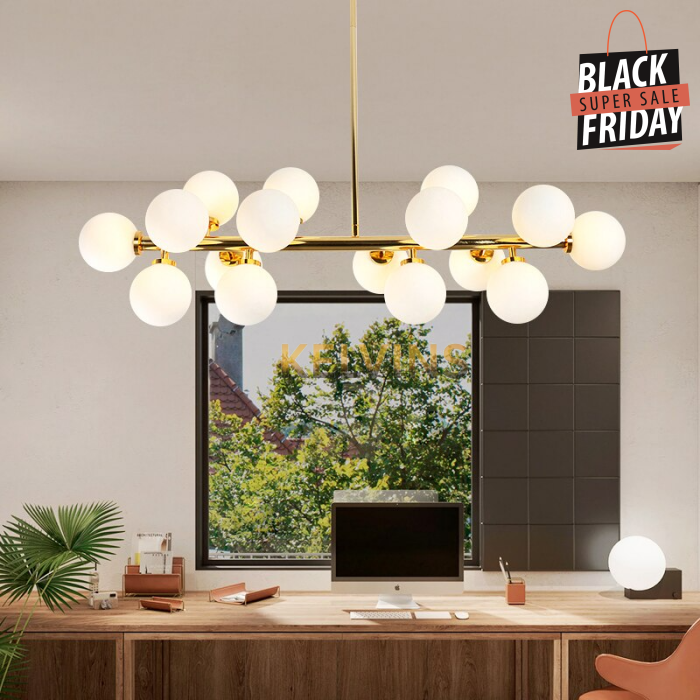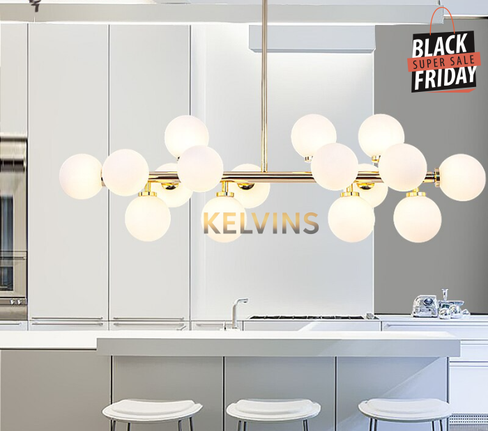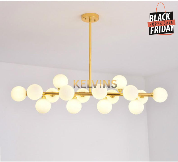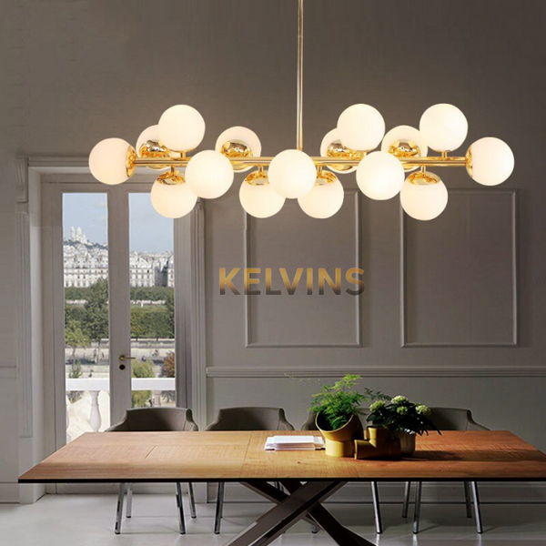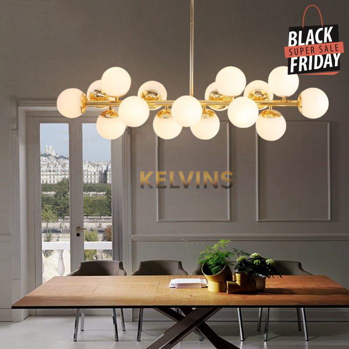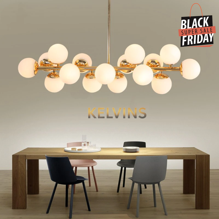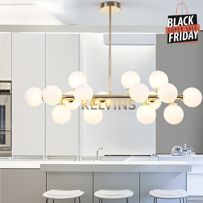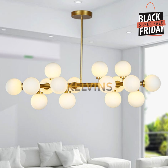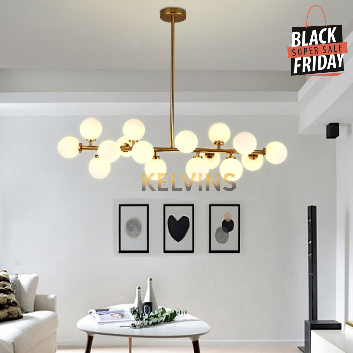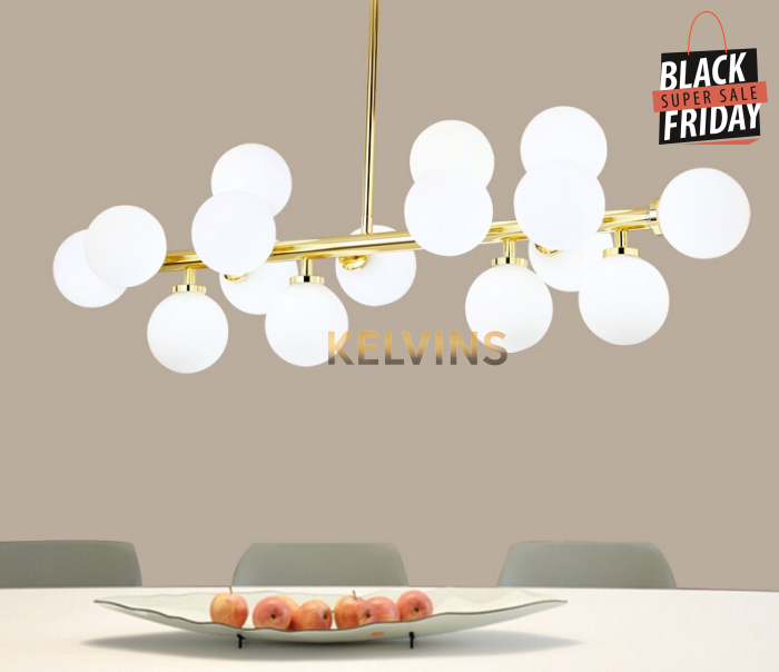 Toute nouvelle toute belle, la nouvelle suspension KAISER arrive sur le site avec un style lumineux qui va vous donner envie de changer la lumière à tous les étages ! Cette suspension génère une intensité lumineuse de 800 lumens . Le produit est fournit sans ampoule. ce modèle contient 16 boules de luminaires.