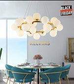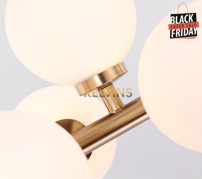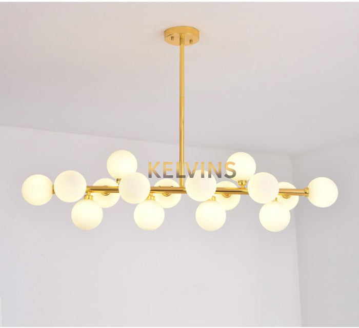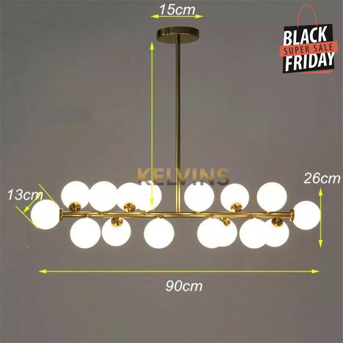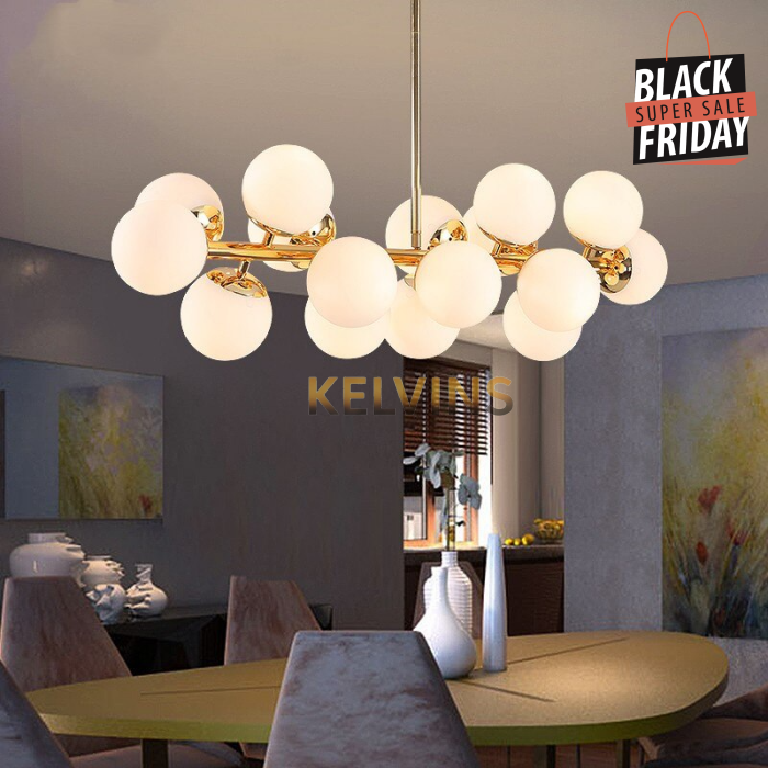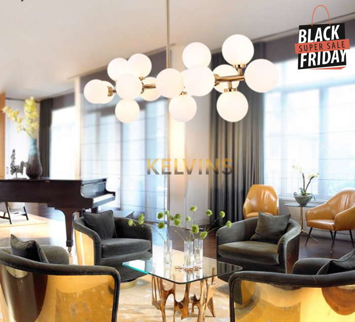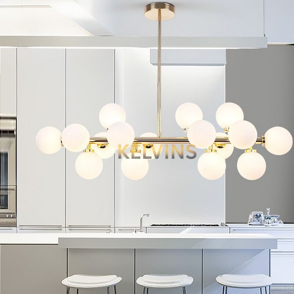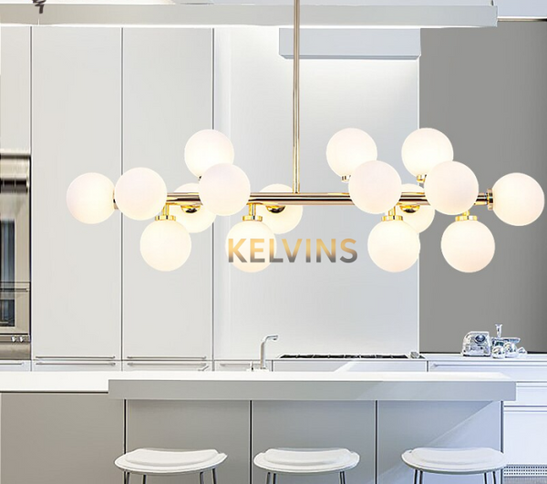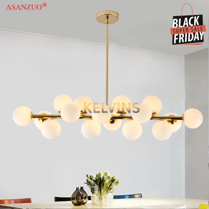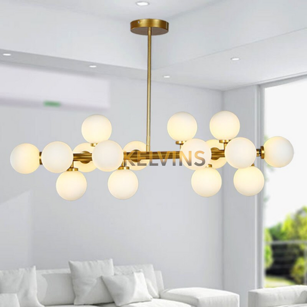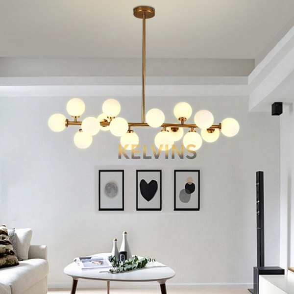 Toute nouvelle toute belle, la nouvelle suspension KAISER arrive sur le site avec un style lumineux qui va vous donner envie de changer la lumière à tous les étages ! Cette suspension génère une intensité lumineuse de 800 lumens . Le produit est fournit sans ampoule. ce modèle contient 16 boules de luminaires.