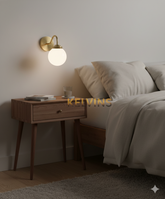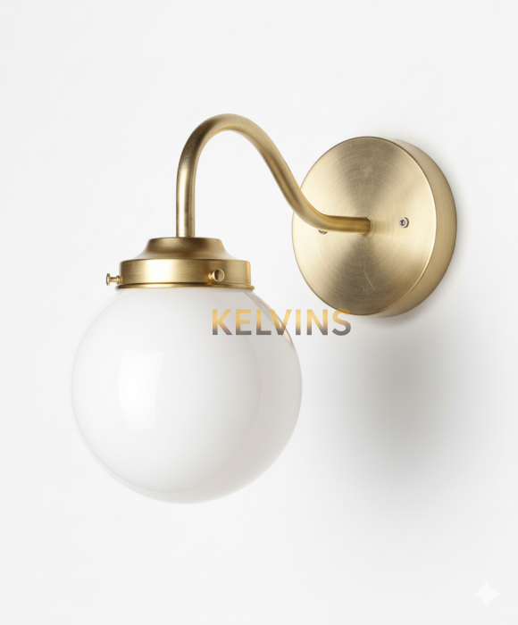 Applique murale ALEXANDRA , modèle de petit diamètre constituée d'une rosace de fixation, d'un bras métallique et d'un diffuseur sphérique en verre opalin soufflé, dans une finition associant une structure chromée